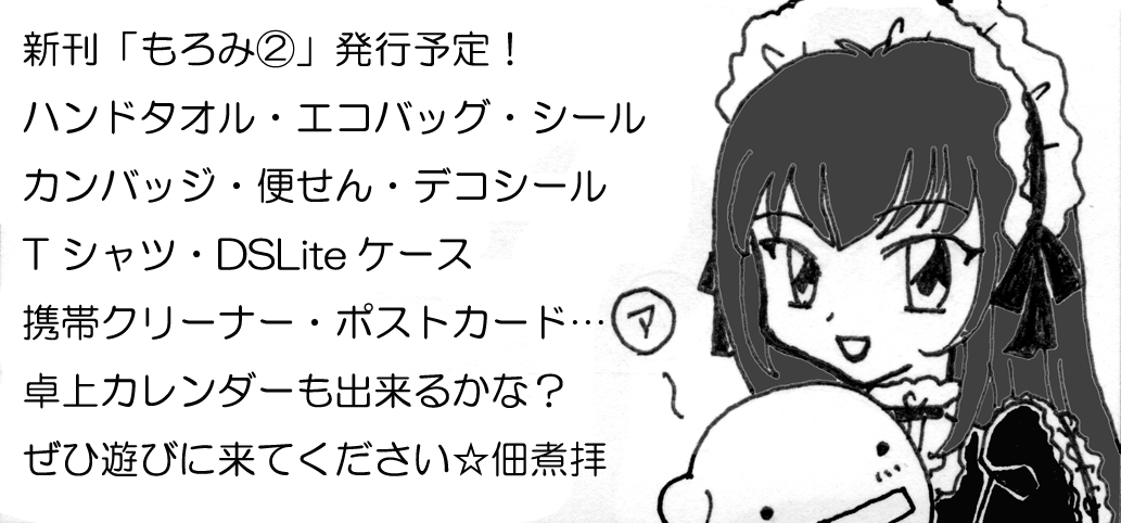 今はデコシールとカレンダーが危ういです…。カレンダーは半ハンドメイドなので、原稿描けば終わると言うものでも無い所がミソです。無理かも知れません…ううぅ、野望が音を立てて崩れてゆく…。当日出来上がってたら誰かホメて…=□○_<バタリ。