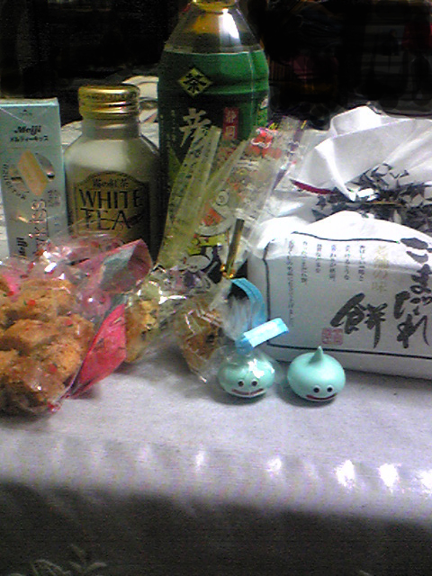 本日の収穫。ミュージアムショップのごまだれ餅は家人に好評でした。飲み物とクッキー2個とスライム2匹はすごろく場でゲット。左のチョコとパンのお菓子は頂き物。後で美味しくいただきますm(_ _)m